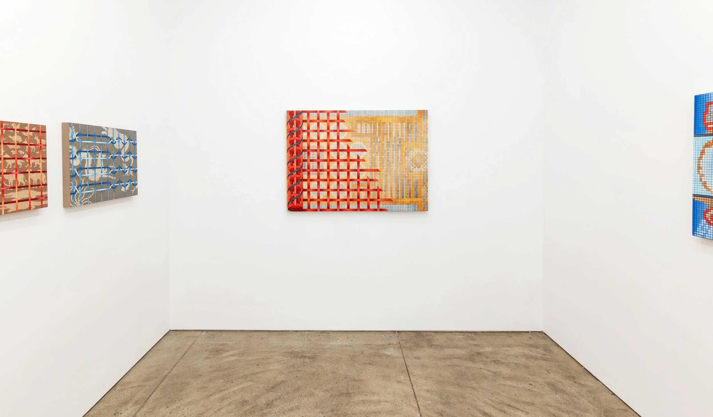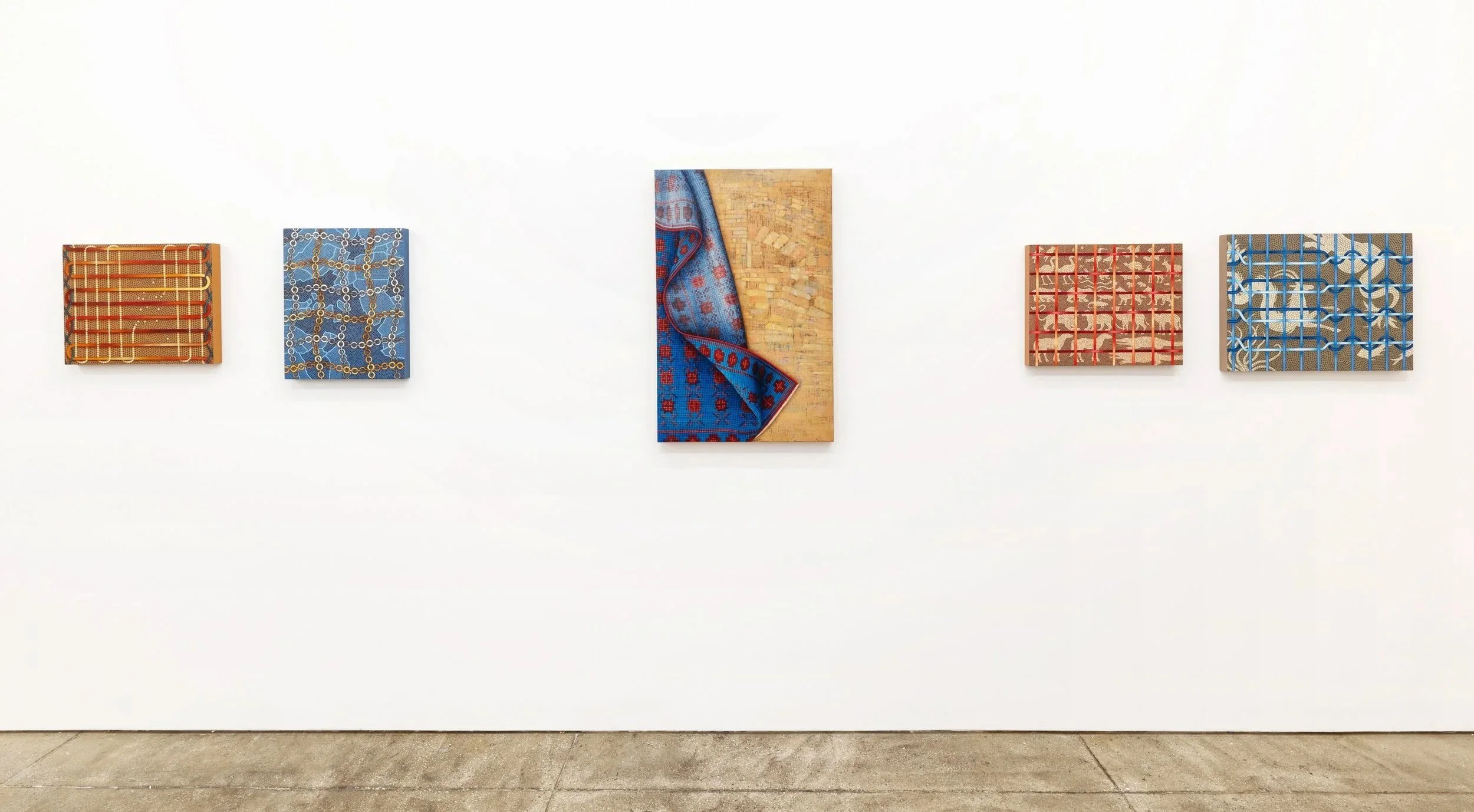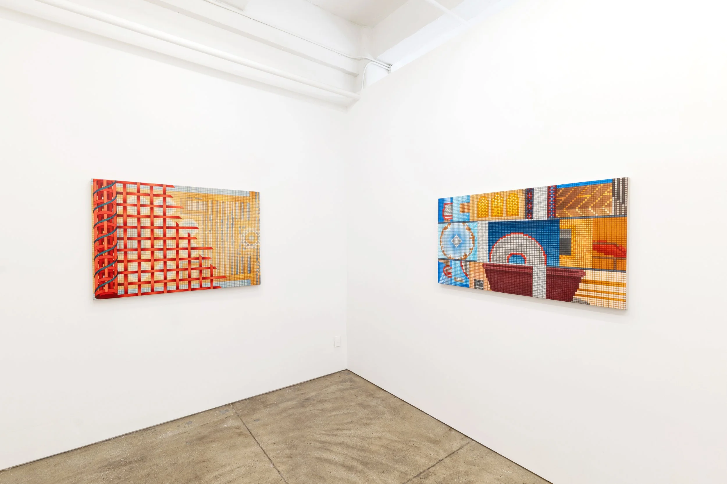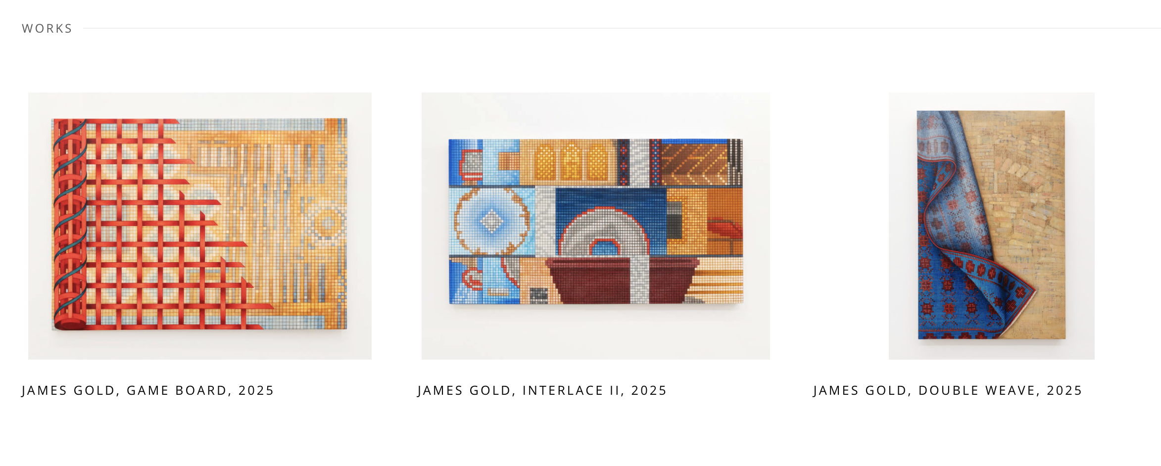 Gold’s work is shaped by his time in Italy as a Fulbright Fellow and his participation in an archaeological project in Cyprus. His practice draws on a wide field of reference: archaeological diagrams, mosaic floors, woven textiles, his own collaged book projects, and the pixel logic of the digital screen. These compositions suggest a continuum where ancient storytelling and contemporary image culture are intertwined threads of the same visual language. Across his surfaces, he stages a dialogue between what is revealed and what remains concealed, between the façade and the guarded interior, inviting viewers to imagine worlds that extend beyond the painting’s edge.